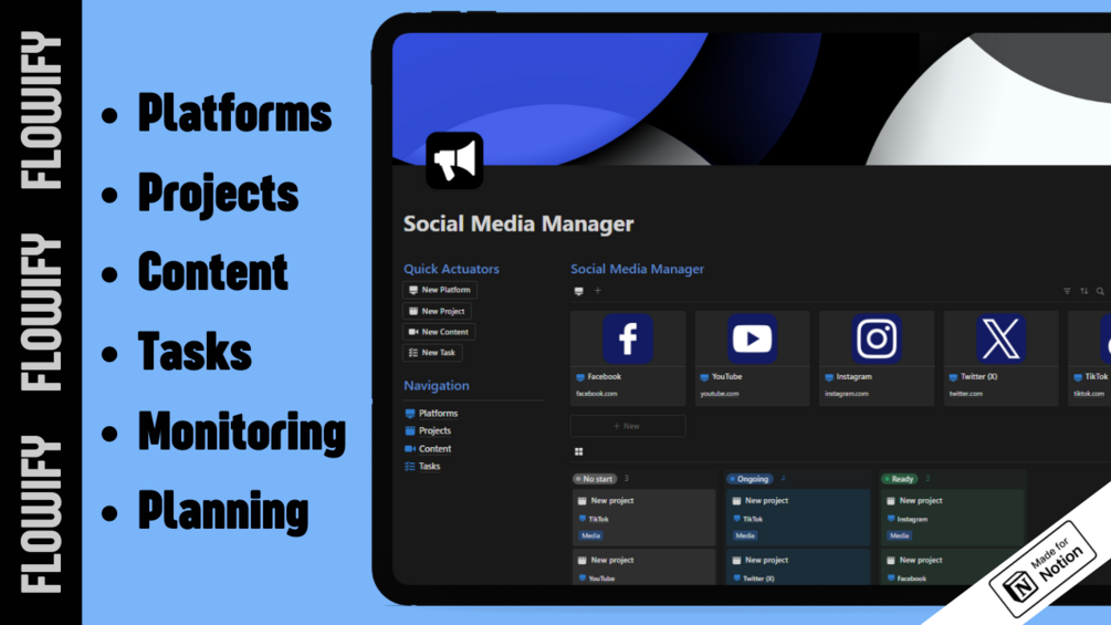 Social Media Manager Pro is your indispensable ally to boost your online presence and take your social media strategies to the next level. With specialized tools to manage multiple platforms, projects, content, tasks and tracking, this platform gives you everything you need to efficiently manage your social networks and increase your digital impact.